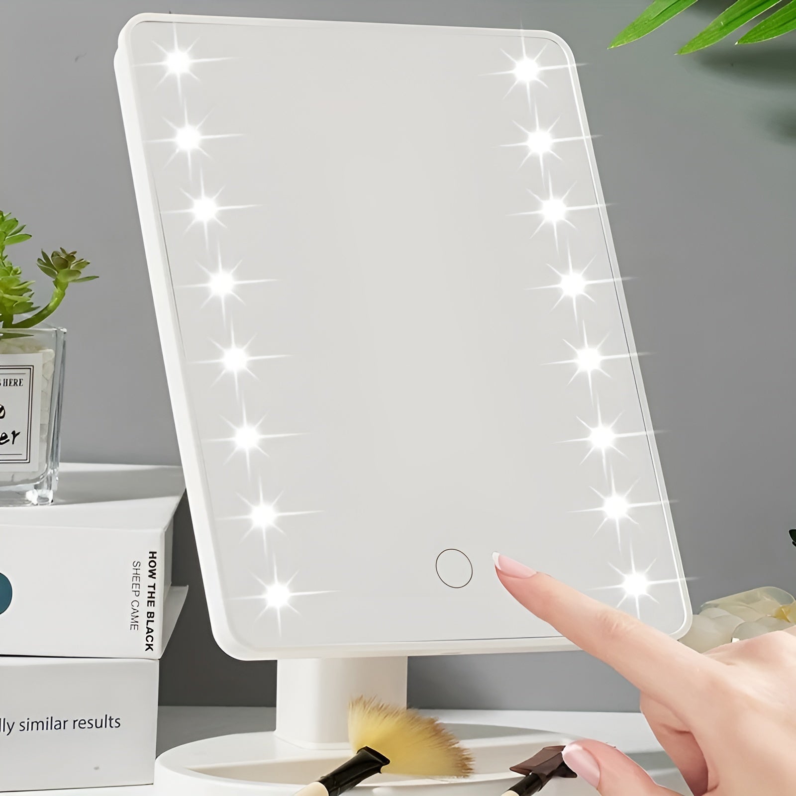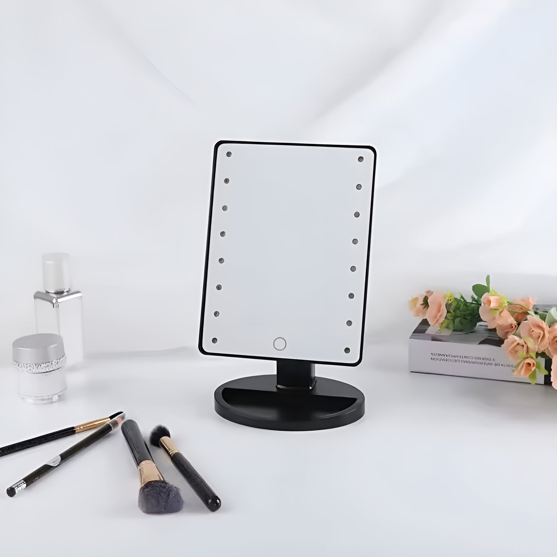 Dzięki 22 diodom LED o regulowanej jasności zawsze stworzysz idealne oświetlenie, niezależnie od tego, czy jesteś w ciemnym pomieszczeniu, czy w naturalnym świetle dziennym. Lustro obracające się o 360° pozwala na łatwą pracę pod dowolnym kątem. A dzięki systemowi czujników dotykowych możesz łatwo regulować natężenie światła jednym dotknięciem.